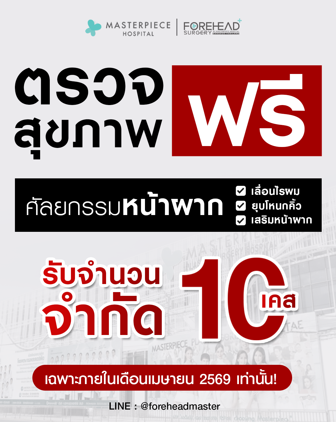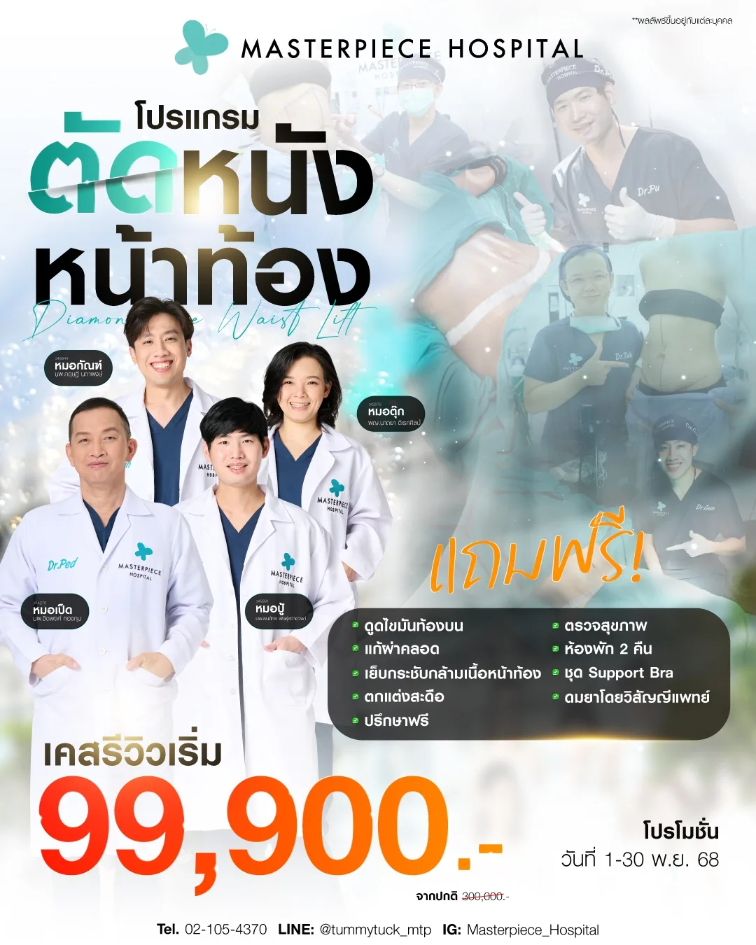 โรงพยาบาลศัลยกรรมมาสเตอร์พีช ศูนย์รวมบริการด้านศัลยกรรมความงาม ช่วยปรับเปลี่ยน ปรับปรุง เพื่อเสริมความมั่นใจให้คุณดูดีมากยิ่งขึ้น ดูแลตั้งแต่หัวจรดเท้า บริการทุกขั้นตอนภายใต้มาตรฐานโรงพยาบาล สะอาด ปลอดภัย เครื่องมือทางการแพทย์ที่มีเทคโนโลยีอันทันสมัย โดยทีมแพทย์ที่มีประสบการณ์ พร้อมบุคลากรที่มีความรู้ความสามารถ ส่งผลให้ Masterpiece Hospital ได้รับความไว้วางใจ จนสามารถก้าวขึ้นมาเป็นโรงพยาบาลชั้นนำ ด้านการดูแลผิวพรรณและศัลยกรรมความงามของเมืองไทย