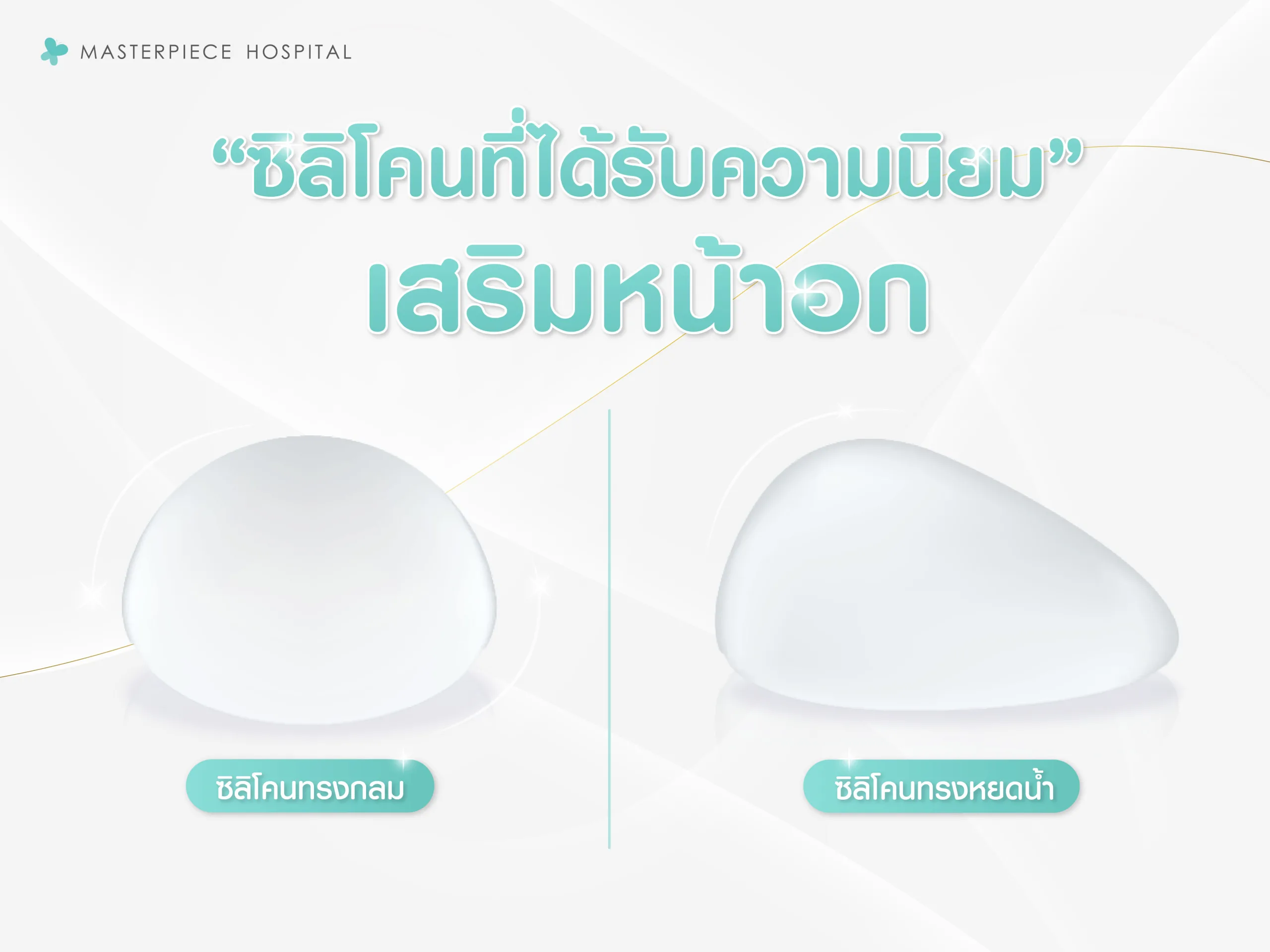ซิลิโคนที่ได้รับความนิยมในปัจจุบันนั้น จะถูกแบ่งออกเป็น 2 ประเภทคือ ทรงกลมและทรงหยดน้ำ ซึ่งทั้งสองรูปแบบก็มีปัจจัยในการเสริมหน้าหรือแก้ไขปัญหาที่แตกต่างกันออกไปดังนี้