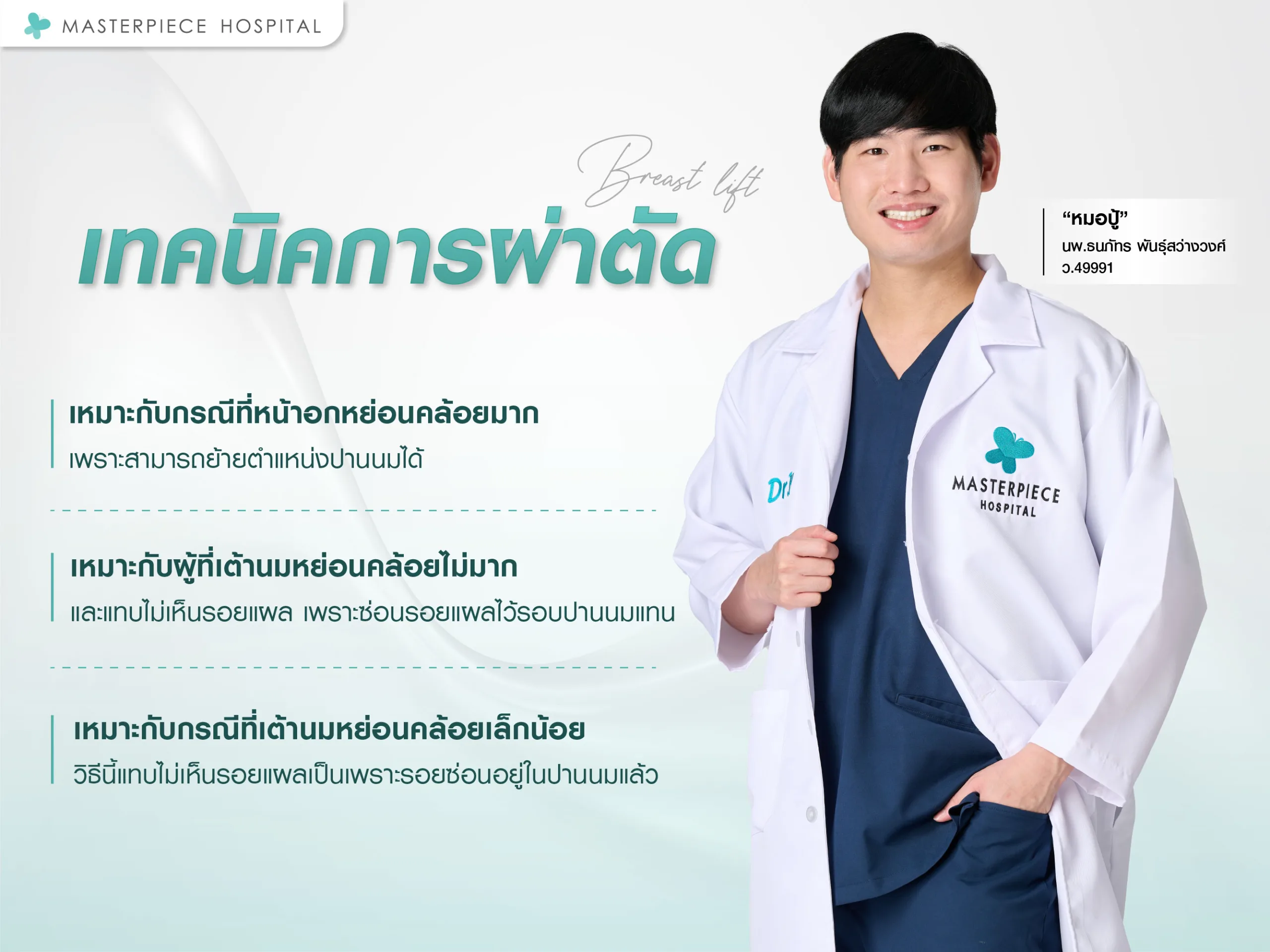การทำศัลยกรรมแก้ไขหน้าอกหย่อนยานที่โรงพยาบาลมาสเตอร์พีซ เพราะทางเรามีความแตกต่างจากที่อื่นด้วยเทคนิคเฉพาะ ทำให้ฟื้นตัวเร็ว บวมช้ำน้อย ดูแลโดยศัลยแพทย์ที่มีประสบการณ์ในทุกเคส ออกแบบทรงได้เฉพาะบุคคล อุปกรณ์ห้องผ่าตัดทันสมัยได้มาตรฐาน ดูแลการดมยาสลบด้วยวิสัญญีแพทย์
