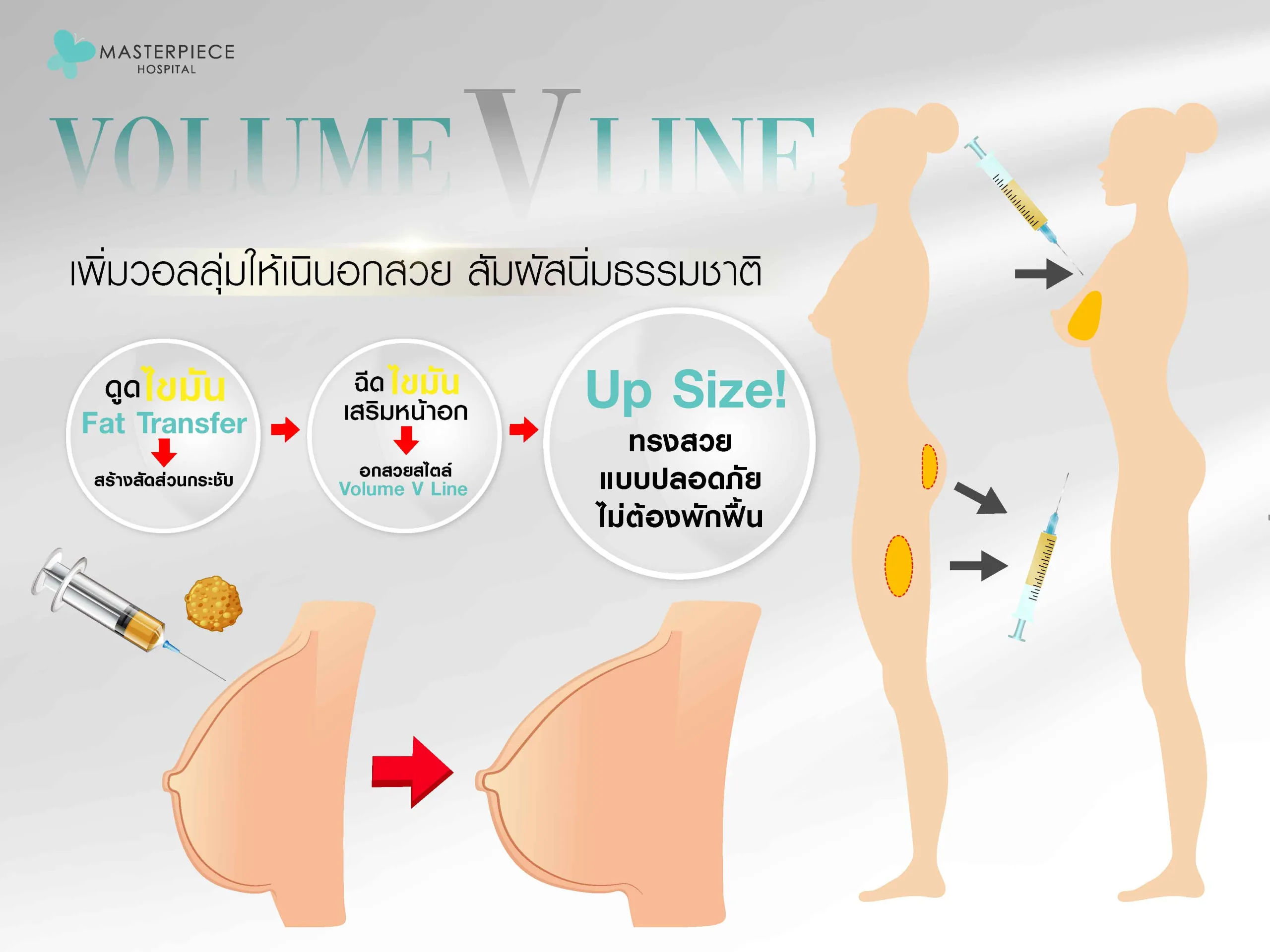 การเสริมหน้าอกด้วยไขมันตัวเอง หรือ Volume V Line คือการใช้วิธีการฉีดไขมันบริเวณเนินอก เพื่อสร้างลักษณะพิเศษที่ทำให้มีรูปทรงหน้าอกที่มีความสวยได้รูปสร้างทรงที่เพอร์เฟคอยู่ได้นาน หากไม่ใส่บราก็ยังมีทรงอกได้รูปทรงที่ดูดีแบบเป็นธรรมชาติ สร้างร่องอกสวยแบบสไตล์ Volume V เพิ่มความเซ็กซี่ได้ไม่ต้องพักฟื้นด้วยการฉีดไขมันเสริมอก เทคนิค Fat transfer แบบไร้ซิลิโคน