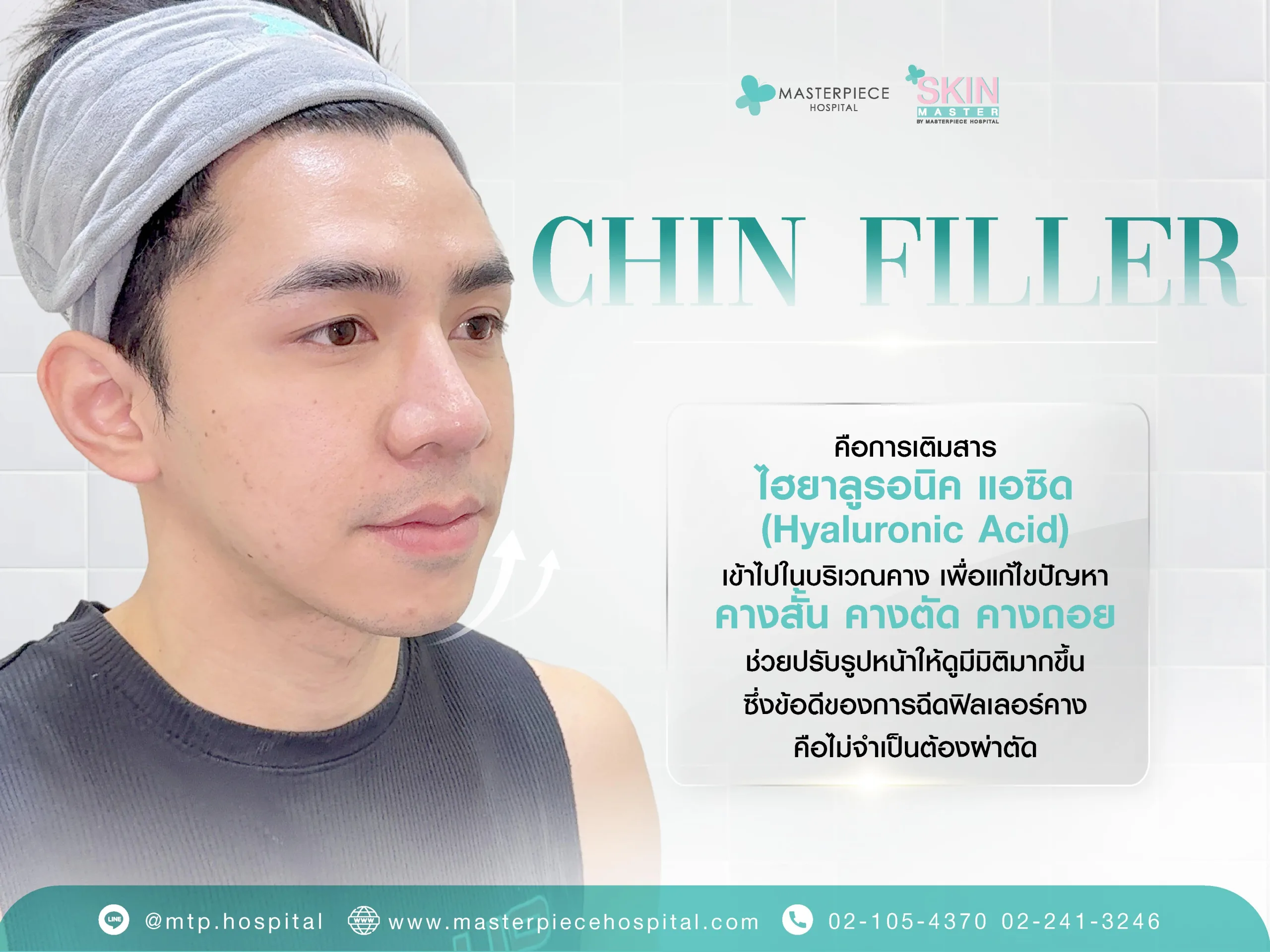 ฟิลเลอร์คาง คือการเติมสารไฮยาลูรอนิค แอซิด (Hyaluronic Acid) เข้าไปในบริเวณคาง เพื่อแก้ไขปัญหาคางสั้น คางตัด คางถอย ช่วยปรับรูปหน้าให้ดูมีมิติมากขึ้น ซึ่งข้อดีของการฉีดฟิลเลอร์คางคือไม่จำเป็นต้องผ่าตัด อาจมีอาการบวมช้ำเล็กน้อย แต่ไม่จำเป็นต้องพักฟื้น และเห็นผลลัพธ์ได้ทันที โดยฟิลเลอร์คางจะสามารถอยู่ได้ 6 เดือนถึง 1 ปี ขึ้นอยู่กับปัจจัยต่าง ๆ แต่ก็สามารถเติมเพิ่มได้เรื่อย ๆ ตามความต้องการ ในกรณีที่ไม่พอใจก็สามารถสลายฟิลเลอร์ได้ ทำให้ฟิลเลอร์คางเป็นหัตถการที่ได้รับความนิยมเป็นอย่างมากในปัจจุบัน