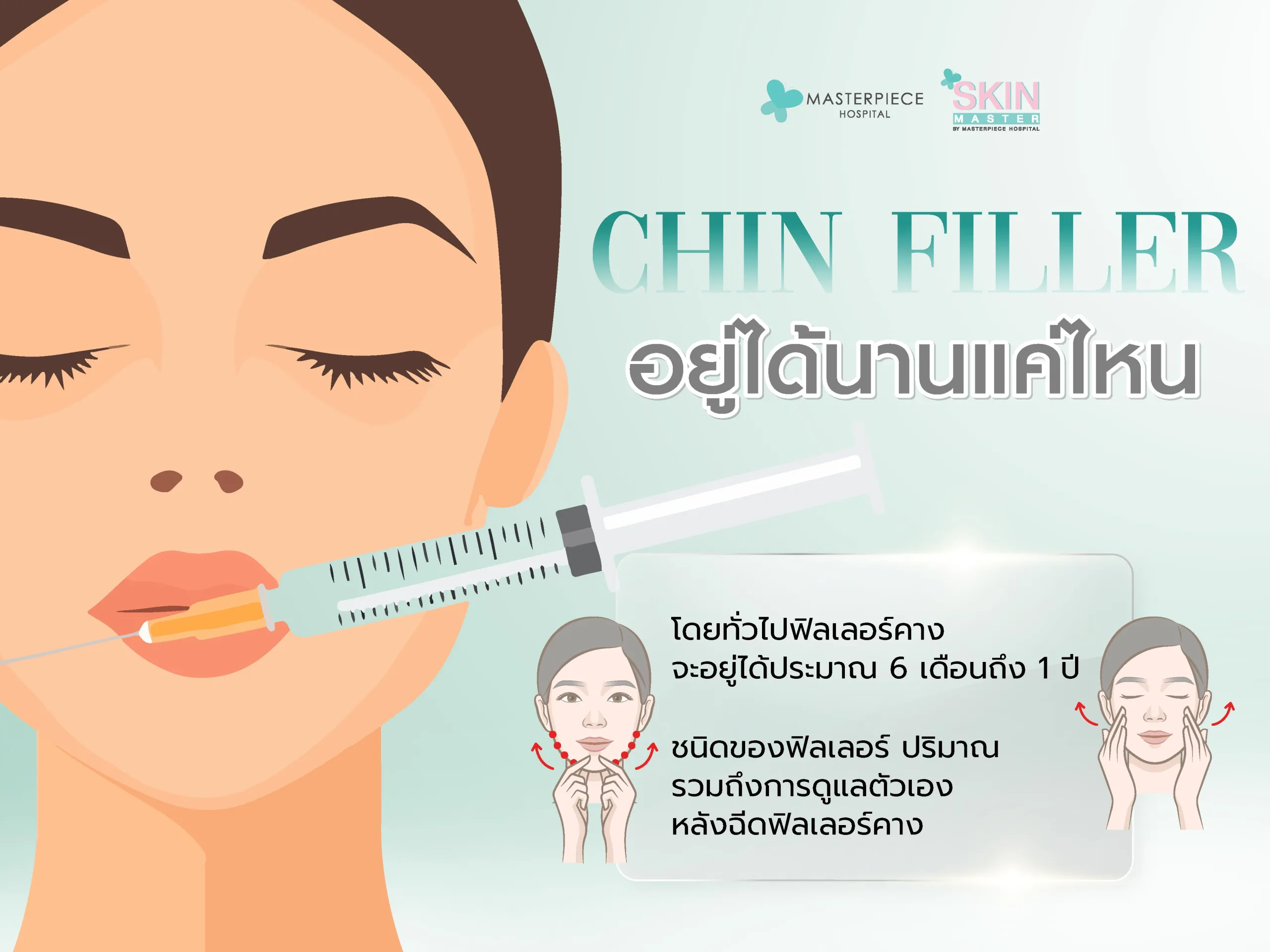 โดยทั่วไปฟิลเลอร์คางจะอยู่ได้ประมาณ 6 เดือนถึง 1 ปี ขึ้นอยู่กับปัจจัยหลาย ๆ อย่าง เช่น ชนิดของฟิลเลอร์ ปริมาณ รวมถึงการดูแลตัวเองหลังฉีดฟิลเลอร์คาง ซึ่งล้วนเป็นปัจจัยสำคัญที่ทำให้สามารถยืดระยะเวลาฟิลเลอร์คางได้ ในกรณีที่ดูแลตัวเองไม่ดี อาจทำให้ฟิลเลอร์คางสลายไปได้เร็วกว่าปกติ แนะนำให้ปฏิบัติตัวตามคำแนะนำของแพทย์อย่างเคร่งครัด จะทำให้ฟิลเลอร์คางอยู่ได้นานขึ้น