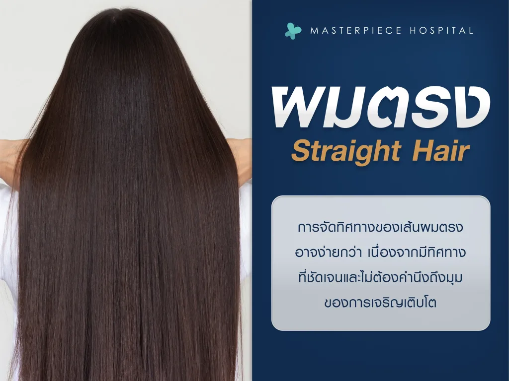 ผมตรง รากผมตรงมักเจริญเติบโตในแนวตั้งและสามารถสกัดได้ง่ายกว่า การสกัดและปลูกผมตรงใช้เทคนิคแบบทั่วไปได้โดยไม่ต้องกังวลเรื่องการจัดทิศทางของเส้นผมมากนัก