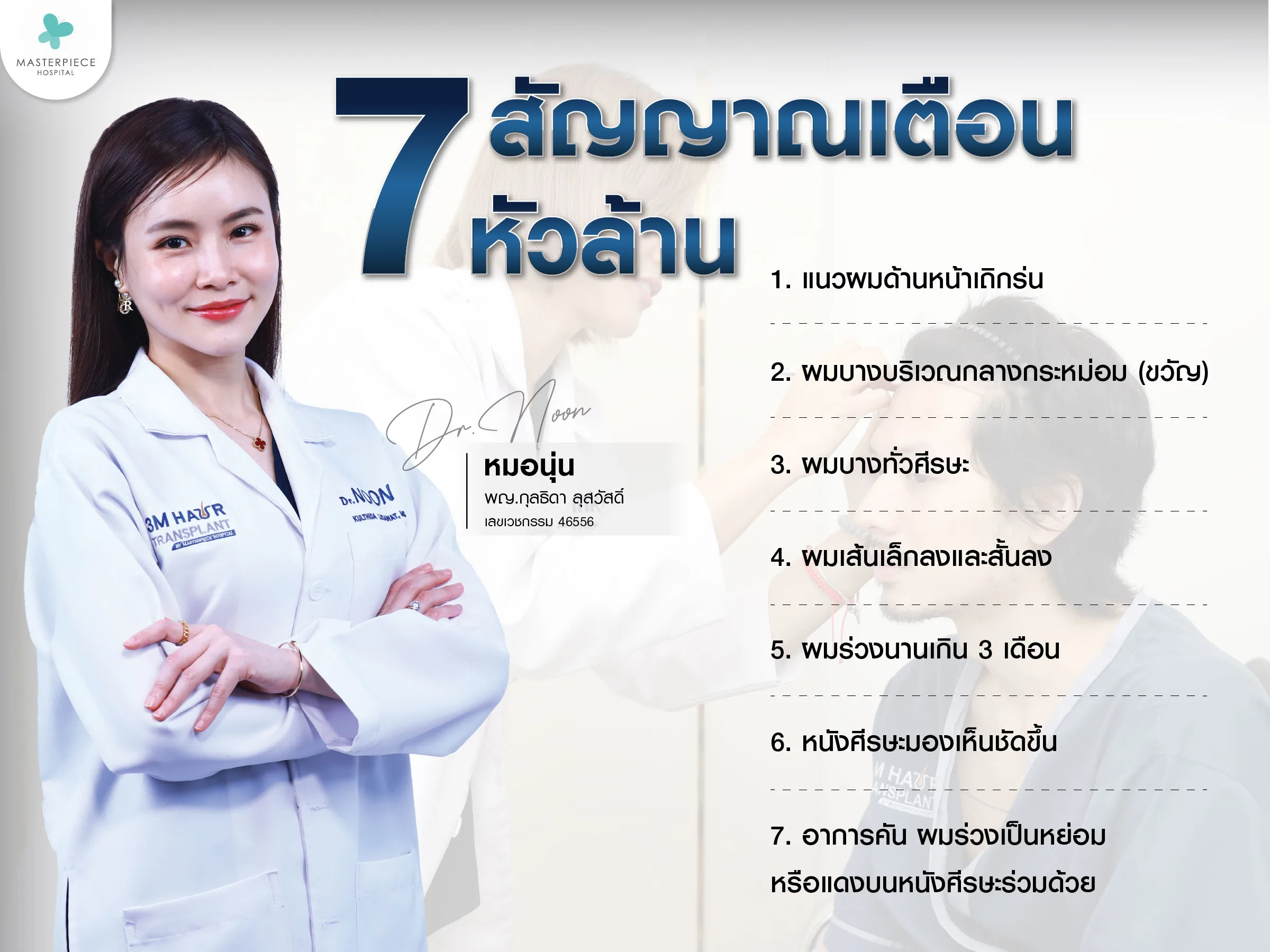 สัญญาณเตือนหัวล้าน เป็นแนวทางในการรับมือกับปัญหาผมร่วง ผมบาง หัวล้านกรรมพันธุ์ แต่ไม่ต้องกังวลไป เพราะในปัจจุบันมีแนวทางการแก้ปัญหาเส้นผมหลากหลายวิธี ไม่ว่าจะเป็นการใช้ยา รวมถึงผลิตภัณฑ์บำรุงเส้นผม และสำหรับใครที่สนใจแก้ไขปัญหาในระยะยาวก็สามารถปลูกผมได้ สำหรับใครที่มีความกังวล โรงพยาบาลมาสเตอร์พีชมีทีมแพทย์ที่มีประสบการณ์พร้อมให้คำปรึกษาโดยไม่มีค่าใช้จ่าย ถ้าสนใจสามารถติดต่อสอบถามได้ที่ 3M Hair transplant By Masterpiece Hospital