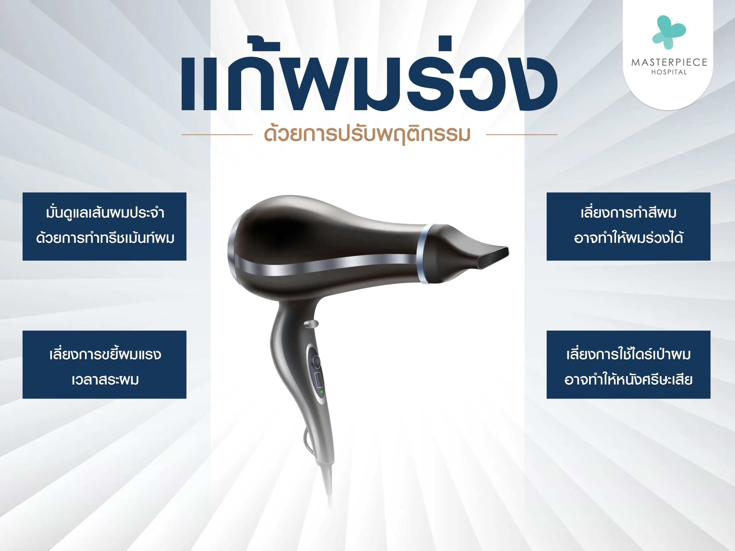 - หลีกเลี่ยงการใช้ไดร์เป่าผมลมร้อน เนื่องจากอาจทำให้หนังศีรษะได้รับความเสียจนทำให้เส้นผมร่วงได้
