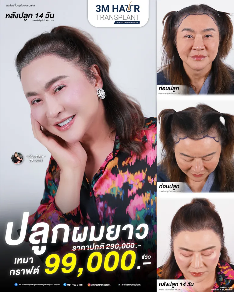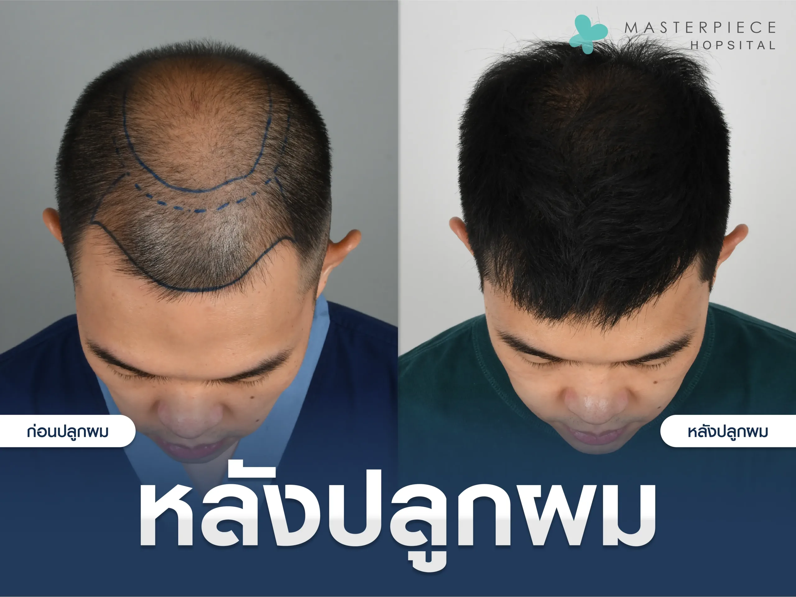 - ผลลัพธ์ที่ชัดเจน: จะเริ่มเห็นผลลัพธ์ที่ชัดเจนภายใน 6-12 เดือน โดยเส้นผมที่ปลูกจะดูเป็นธรรมชาติ กลมกลืนกับเส้นผมเดิม และช่วยปกปิดบริเวณที่ผมบางหรือศีรษะล้านได้อย่างมีประสิทธิภาพ