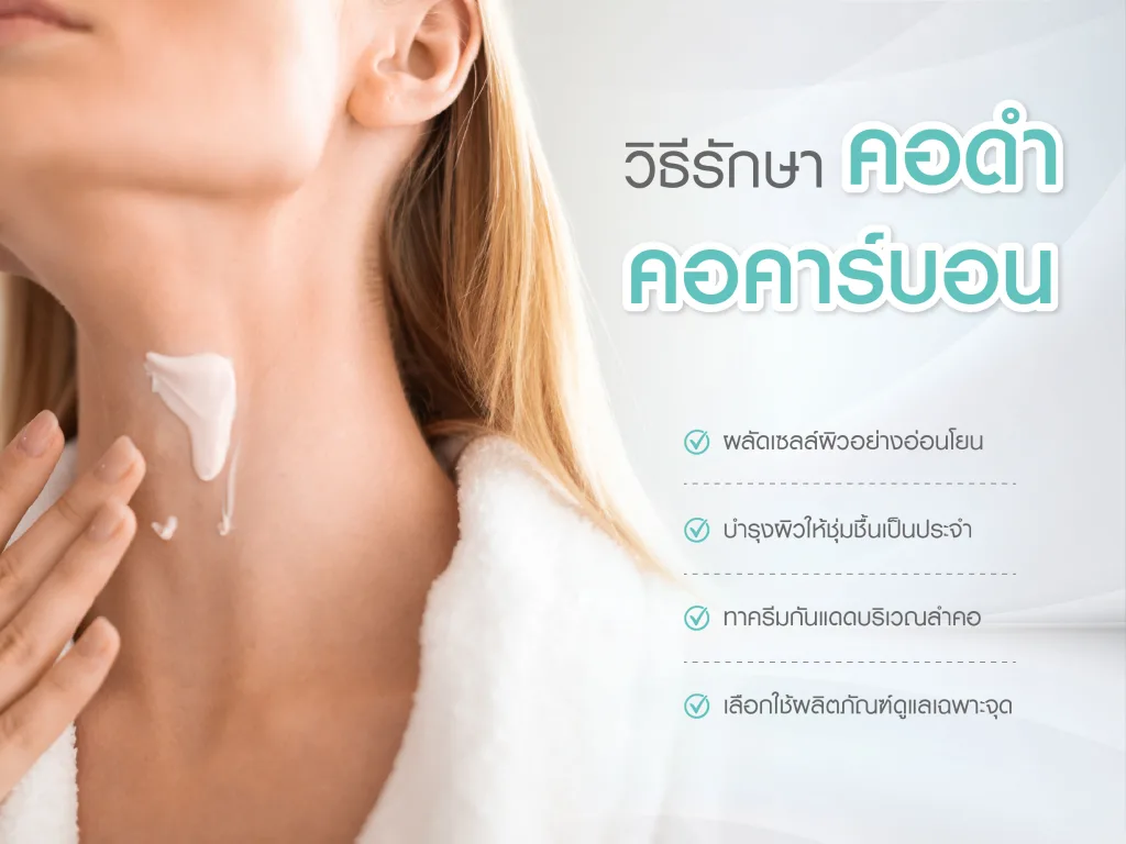 - บำรุงผิวให้ชุ่มชื้นเป็นประจำ ผิวที่ชุ่มชื้นจะดูเรียบเนียนขึ้นและลดโอกาสเกิดรอยคอดำซ้ำ