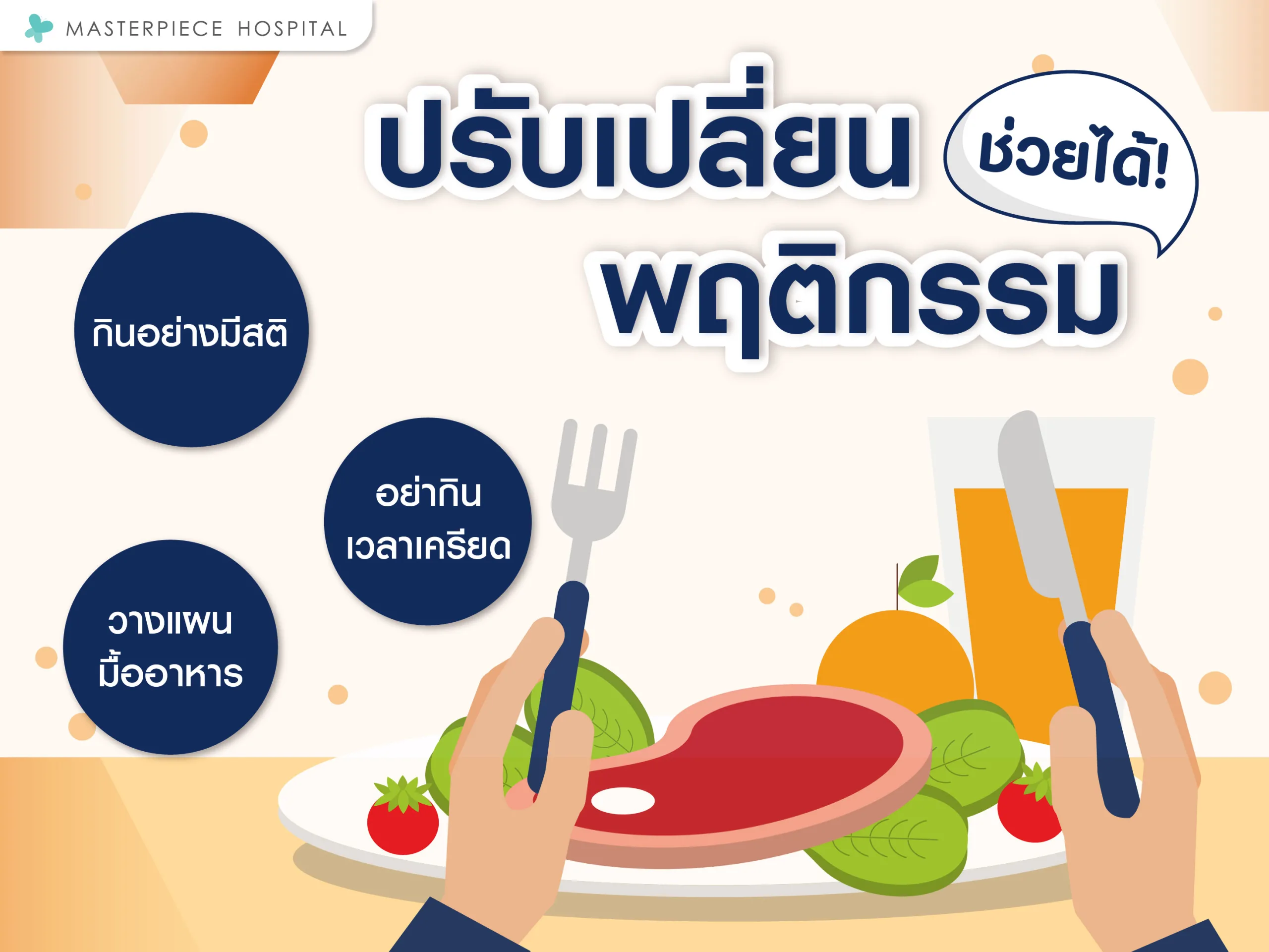 การกินอย่างมีสติ ถือว่าเป็นการฝึกปรับพฤติกรรมได้ดี อาจเริ่มต้นจากการกินให้ช้าลง เคี่ยวอาหารให้ละเอียดมากขึ้น หรือหยุดกินเมื่ออิ่มไม่จำเป็นต้องฝืนกินให้หมด เลือกกินให้เป็นเวลา และเลือกกินอาหารที่มีประโยชน์ตามที่นักโภชนาการแนะนำ