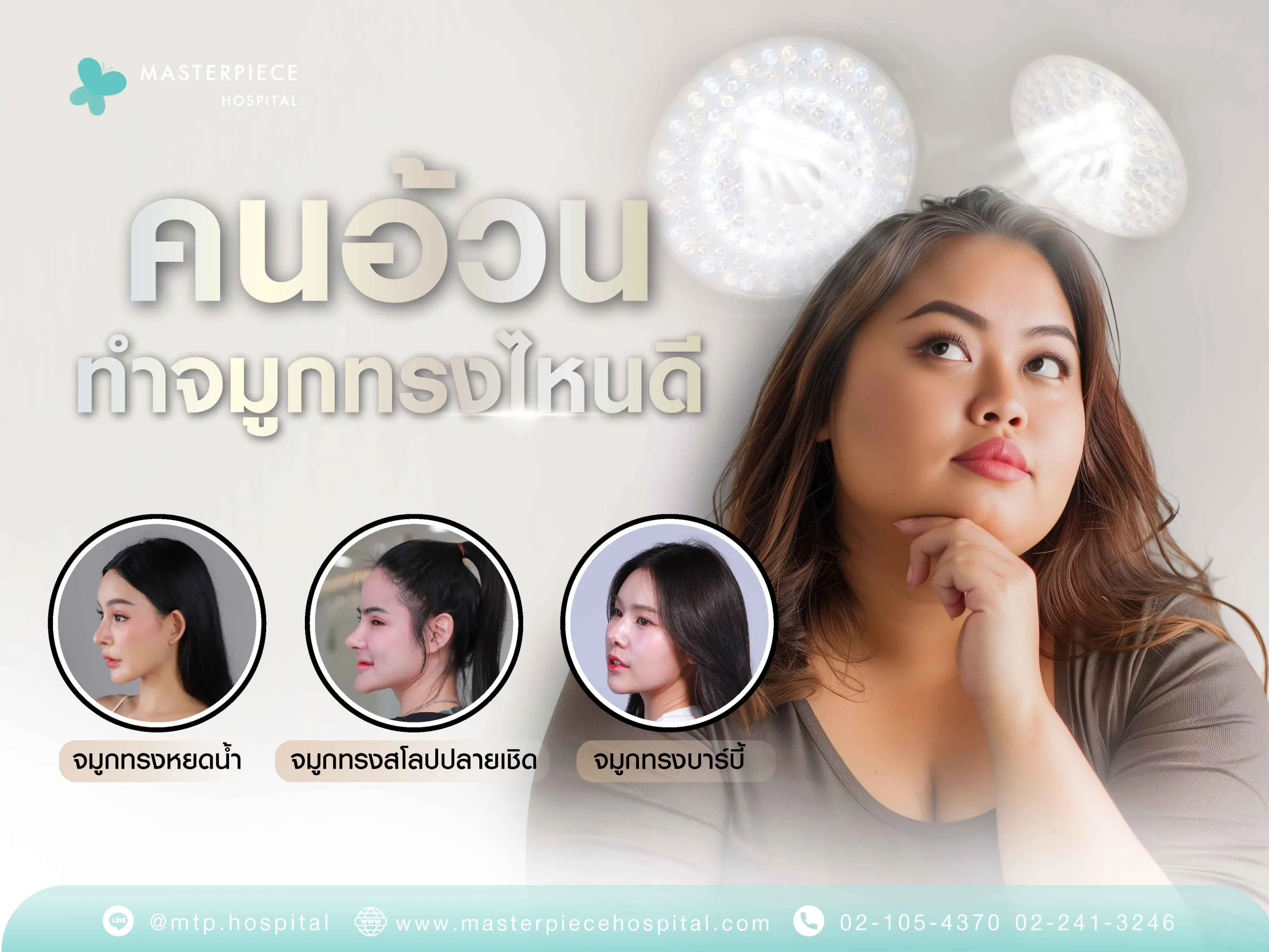 คนอ้วนทำจมูก คือคนที่มีลักษณะใบหน้าอ้วนกลม ใหญ่ หรือบาน จากการสะสมของไขมัน จนทำให้รูปทรงจมูกดูเล็กไม่เหมาะกับใบหน้า ซึ่งรูปทรงจมูกที่เหมาะกับคนอ้วนมีดังนี้