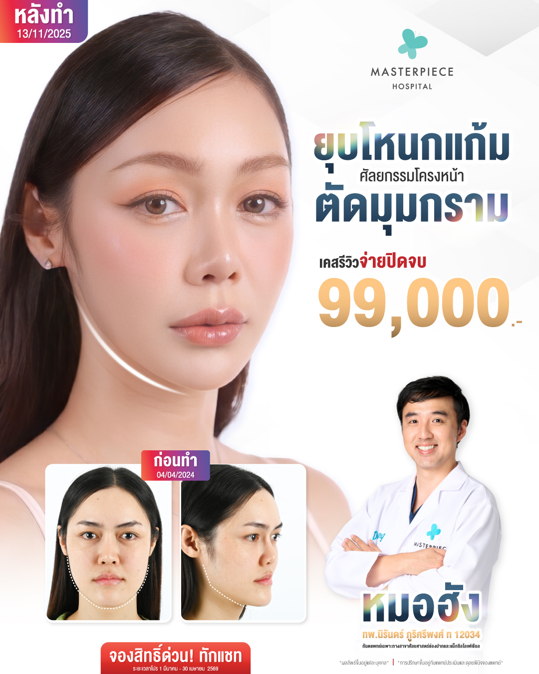 โรงพยาบาลศัลยกรรมมาสเตอร์พีช โดยมี คุณหมอเส นพ.ระวีวัฒน์ มาศฉมาดล หัวหน้าทีมแพทย์ที่มีประสบการณ์ด้านความงามมาอย่างยาวนาน พร้อมทีมแพทย์ที่มีประสบการณ์ ดูแลทุกขั้นตอนในระหว่างการบริการอย่างใกล้ชิด ซึ่งแพทย์แต่ละท่านจะมีความสามารถเฉพาะทาง ทำให้สามารถเน้นจุดสำคัญที่ต้องการดูแลอย่างได้ผล ไม่ว่าจะเป็นการศัลยกรรมจมูก ทำตา การดูแลผิวพรรณ เสริมคาง ศัลยกรรมปลูกผม การปรับแต่งบริเวณรูปร่างเฉพาะจุดให้ดูดี ดูสวย โดยคุณหมอจะทำการวิเคราะห์และพูดคุยตั้งแต่ขั้นตอนแรก เพื่อรับฟังสิ่งที่ลูกค้าต้องการ จนสามารถแก้ไขได้อย่างตรงจุด