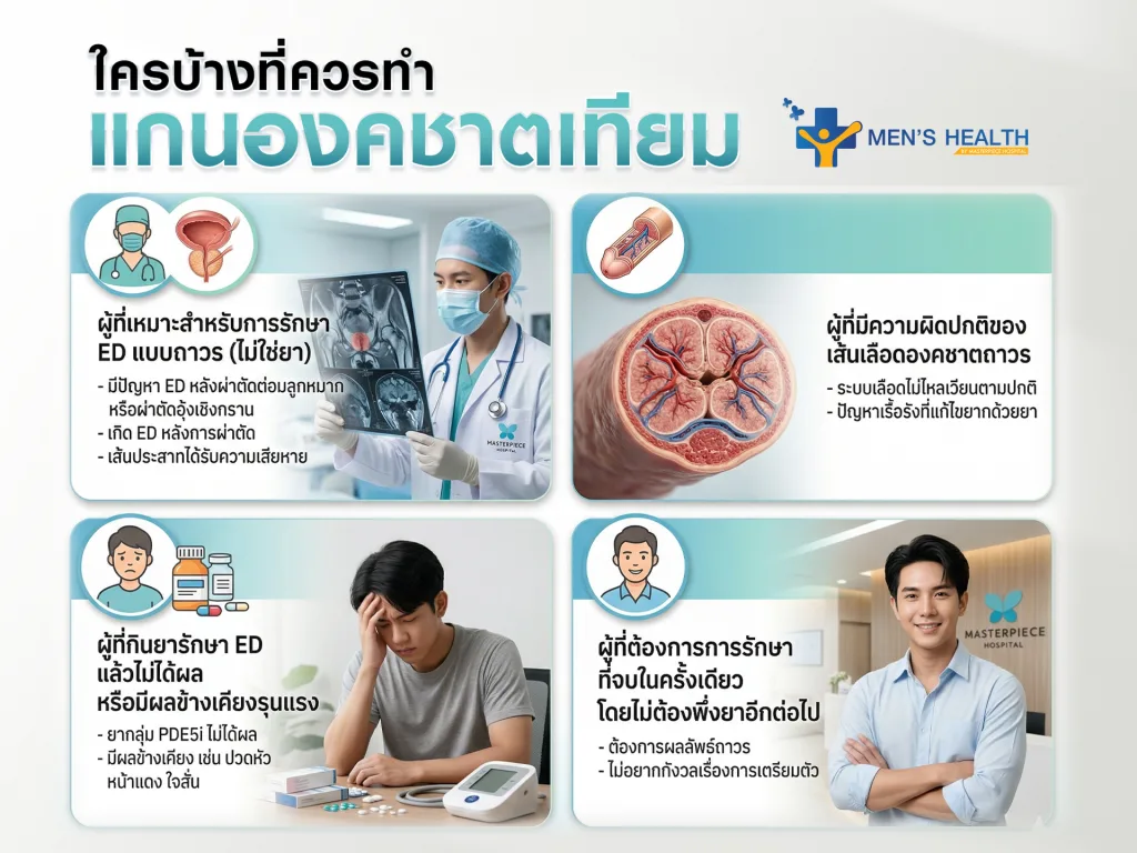 - ผู้ที่กินยารักษา ED แล้วไม่ได้ผล หรือมีผลข้างเคียงรุนแรง