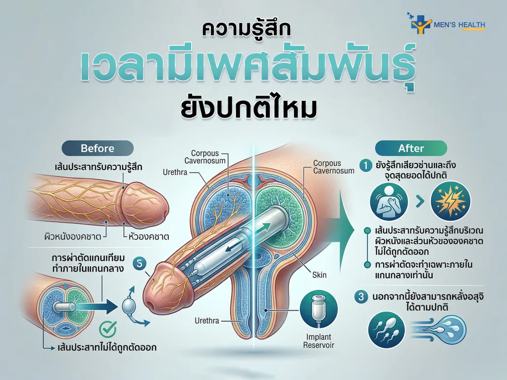 นี่คือคำถามที่พบบ่อยที่สุด คำตอบคือ “ยังรู้สึกเสียวซ่านและถึงจุดสุดยอดได้ปกติ” เนื่องจากเส้นประสาทที่รับความรู้สึกบริเวณผิวหนังและส่วนหัวขององคชาตไม่ได้ถูกตัดออก การผ่าตัดแกนองคชาตเทียม จะทำเฉพาะภายในแกนกลางเท่านั้น นอกจากนี้ยังสามารถหลั่งอสุจิได้ตามปกติ