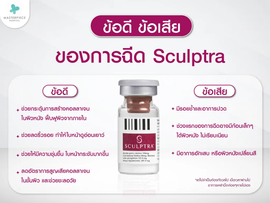 ในส่วนของข้อเสีย Sculptra ได้แก่ มีรอยช้ำและอาการปวด, ช่วงแรกของการฉีดอาจมีก้อนเล็ก ๆ ใต้ผิวหนัง ไม่เรียบเนียน, มีอาการอักเสบ หรือผิวหนังเปลี่ยนสี ซึ่งจะขึ้นอยู่กับแต่ละคน, ต้องคอยนวดอยู่เสมอ เพื่อกระตุ้นให้สารกระจายไปทั่วถึง แต่ไม่จำเป็นต้องกังวลไป เพราะ Sculptra ใช้สารที่ได้รับการรับรอง เมื่อเวลาผ่านไป อาการเหล่านี้จะค่อย ๆ หายไปเอง อย่างไรก็ตาม ควรดูแลตัวเองตามคำแนะนำของแพทย์ เพราะถ้าหากดูแลตัวเองผิดวิธี อาจทำให้เกิดการติดเชื้อได้