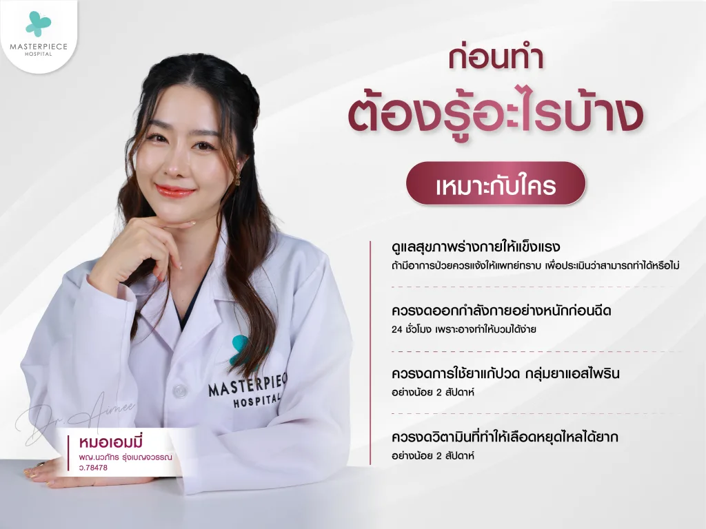- ควรงดออกกำลังกายอย่างหนักก่อนฉีด 24 ชั่วโมง เพราะอาจทำให้บวมได้ง่าย