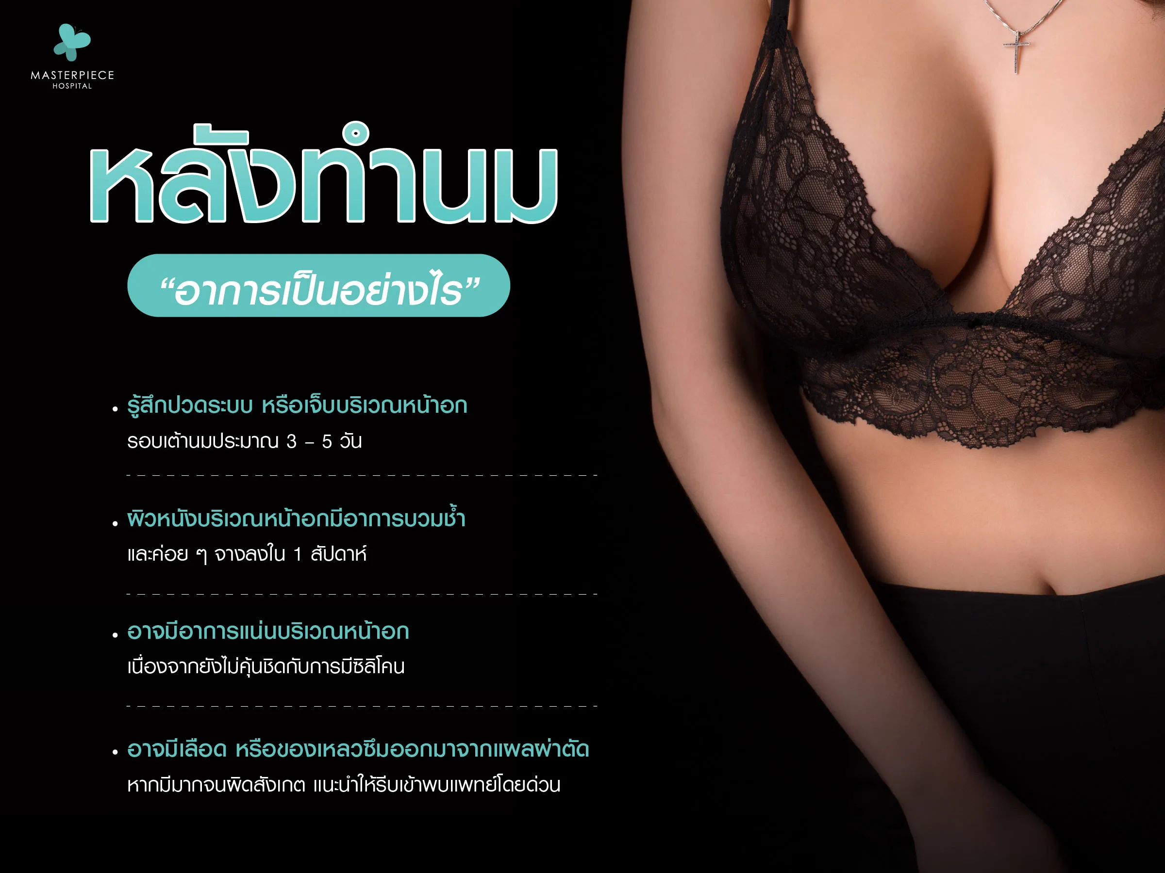อาการหลังทำนม หรือผ่าตัดเสริมหน้าอกของแต่ละเคสนั้น จะมีความรุนแรงที่แตกต่างกันขึ้นอยู่กับสภาพร่างกายของแต่ละบุคคล แต่โดยส่วนใหญ่แล้วจะมีอาการปกติดังต่อไปนี้